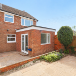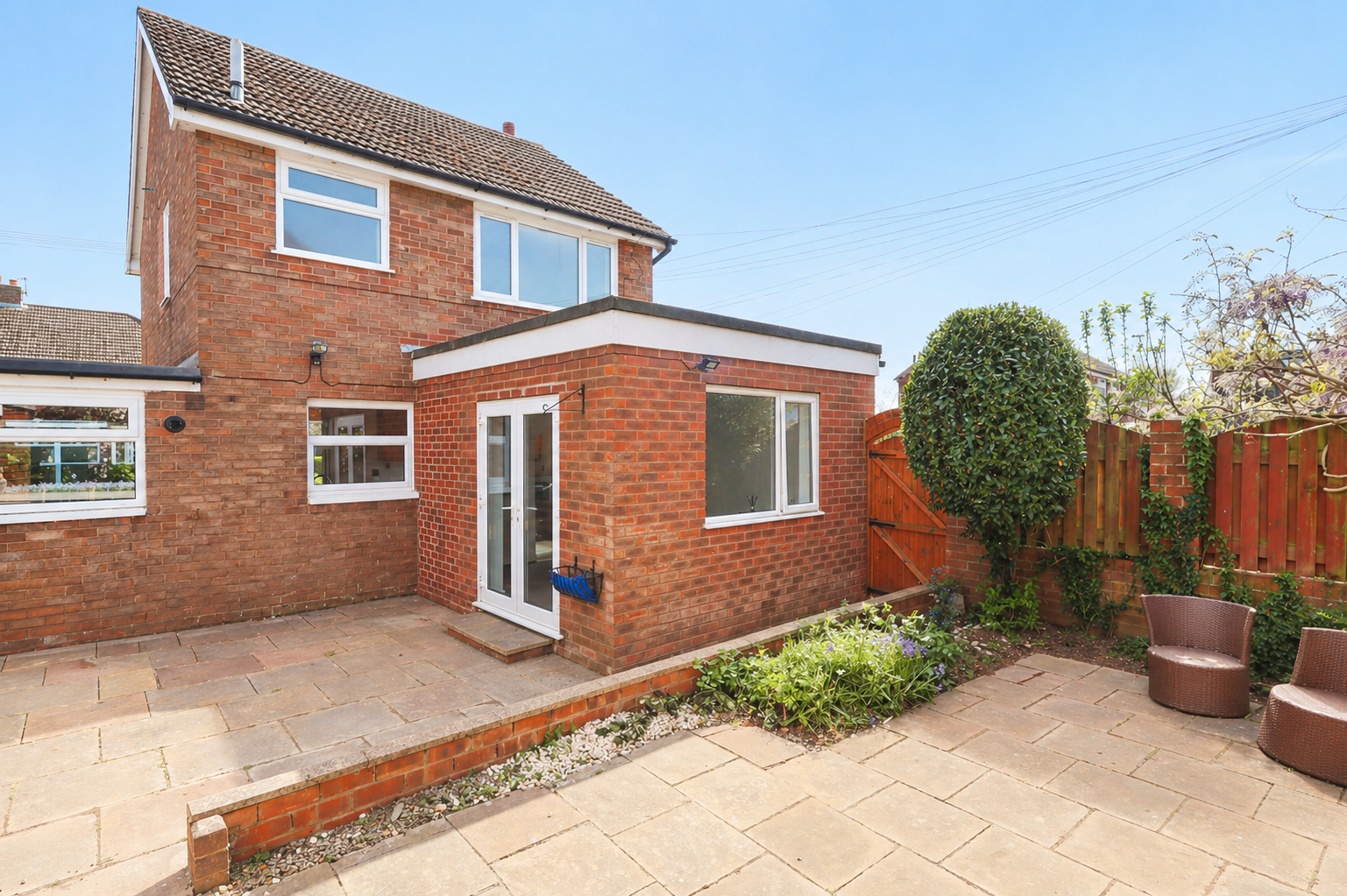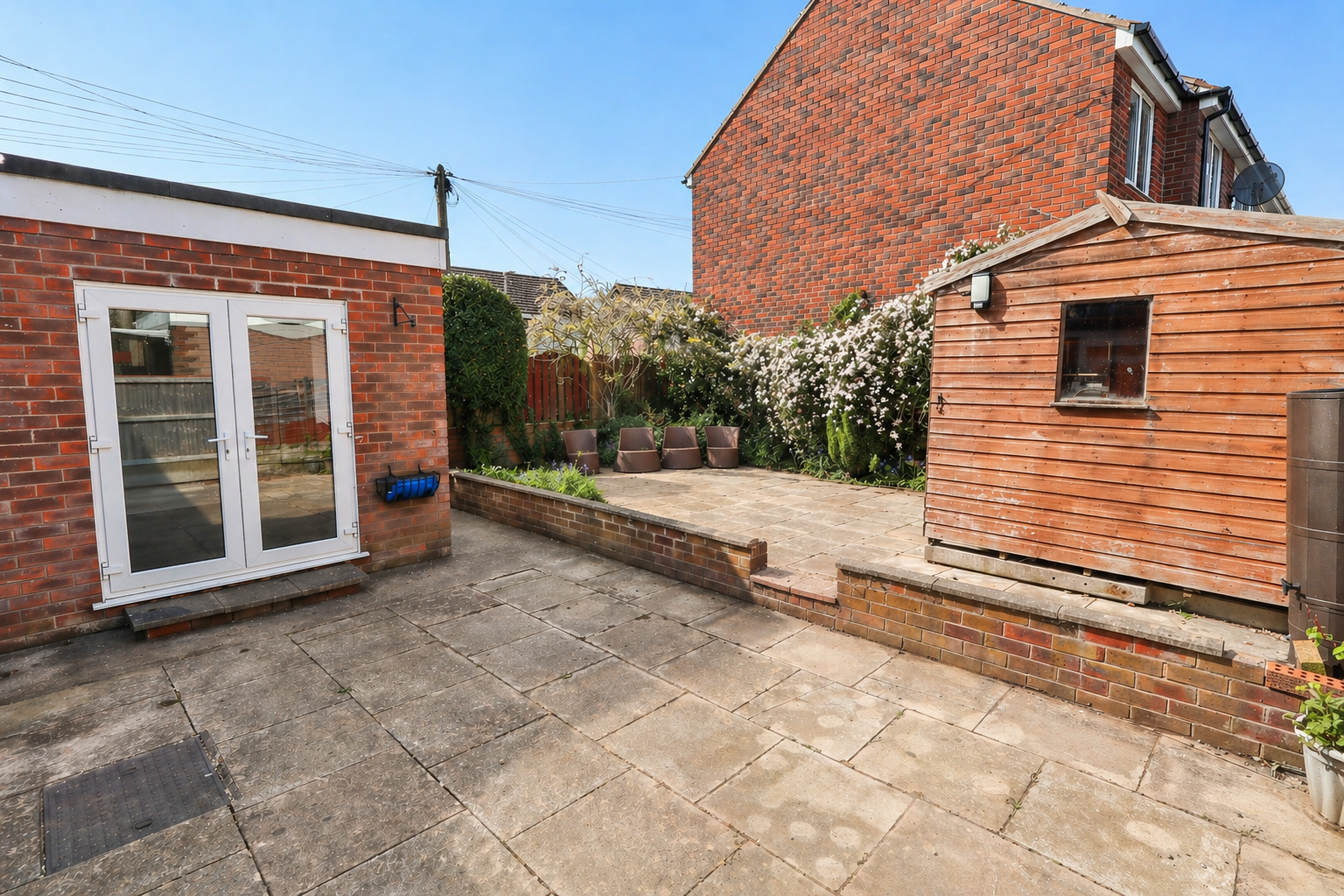 Externally the property benefits from a hedge fronted, lawned front garden with driveway parking leading up to the garage and side paved garden area. To the rear is a low maintenance, paved garden with planted borders and shed.