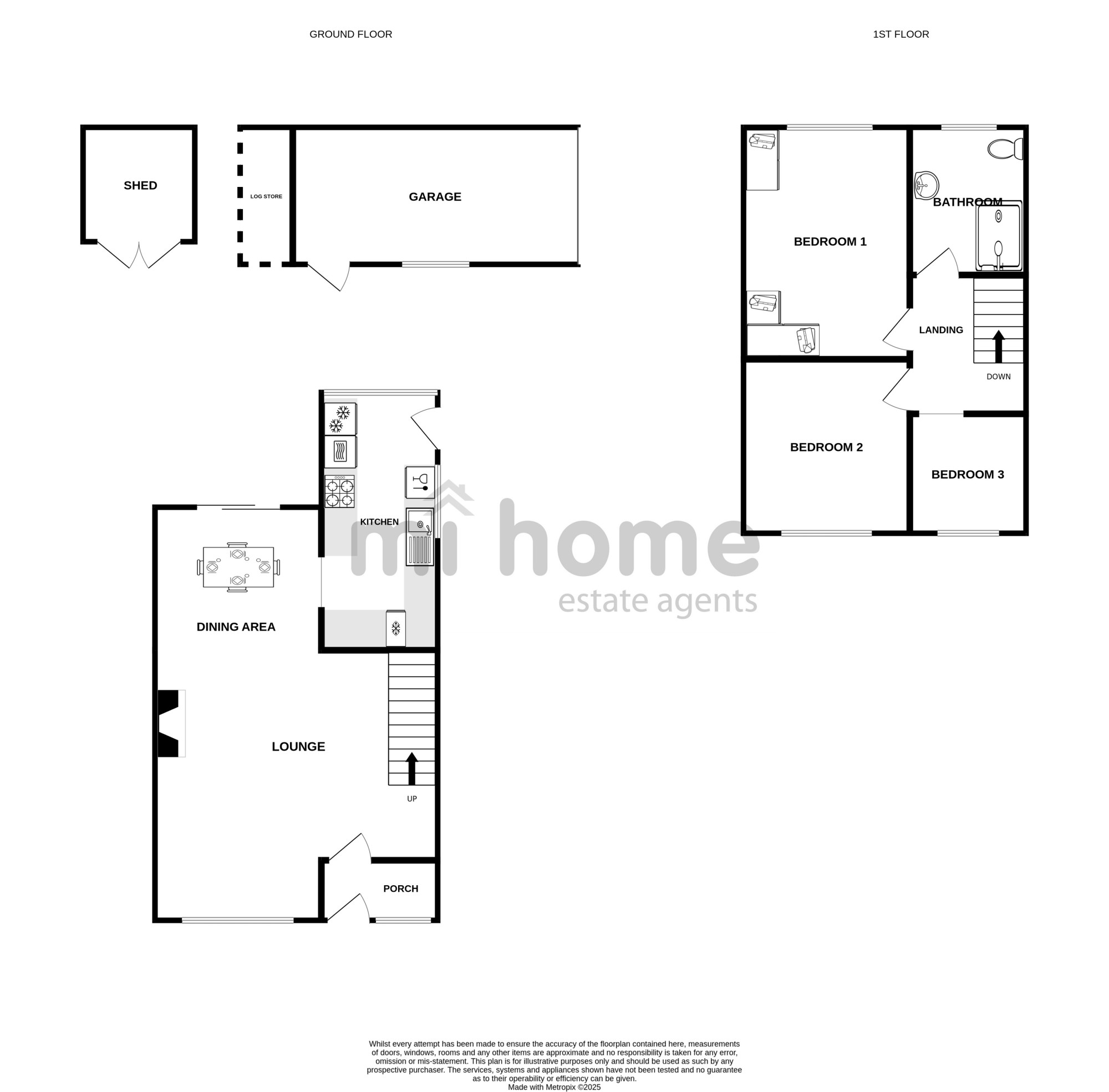 Externally the property commands a large corner plot with wrap around gardens. Hedge lined with lawned South West facing front and side garden. To the rear are patio areas with decorative loose stone planters, large metal outbuilding, log store, garage and driveway parking.